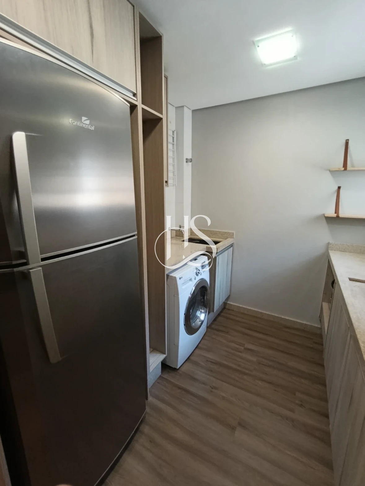 Móveis planejados na área social, cozinha, lavanderia, dormitório de casal e banheiro.
