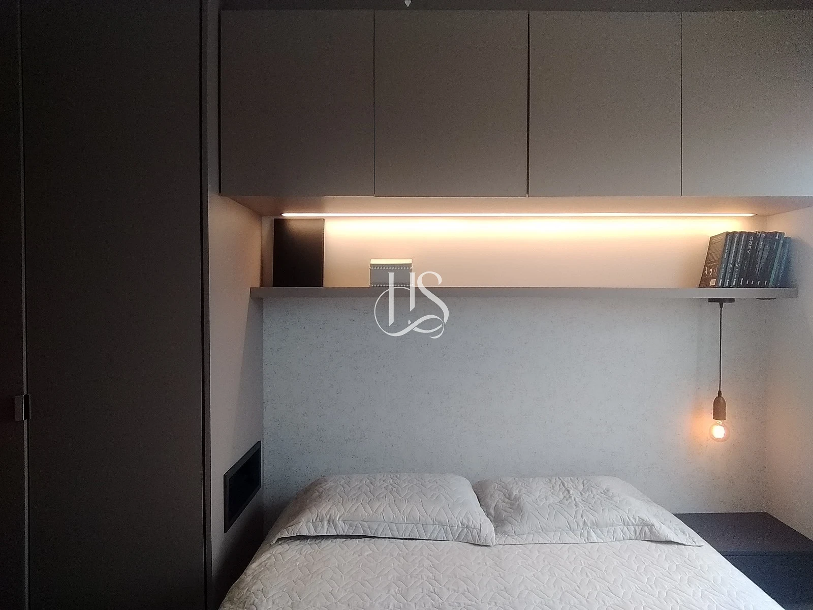 Cabeceira planejada no dormitório de casal, com tomadas individuais.